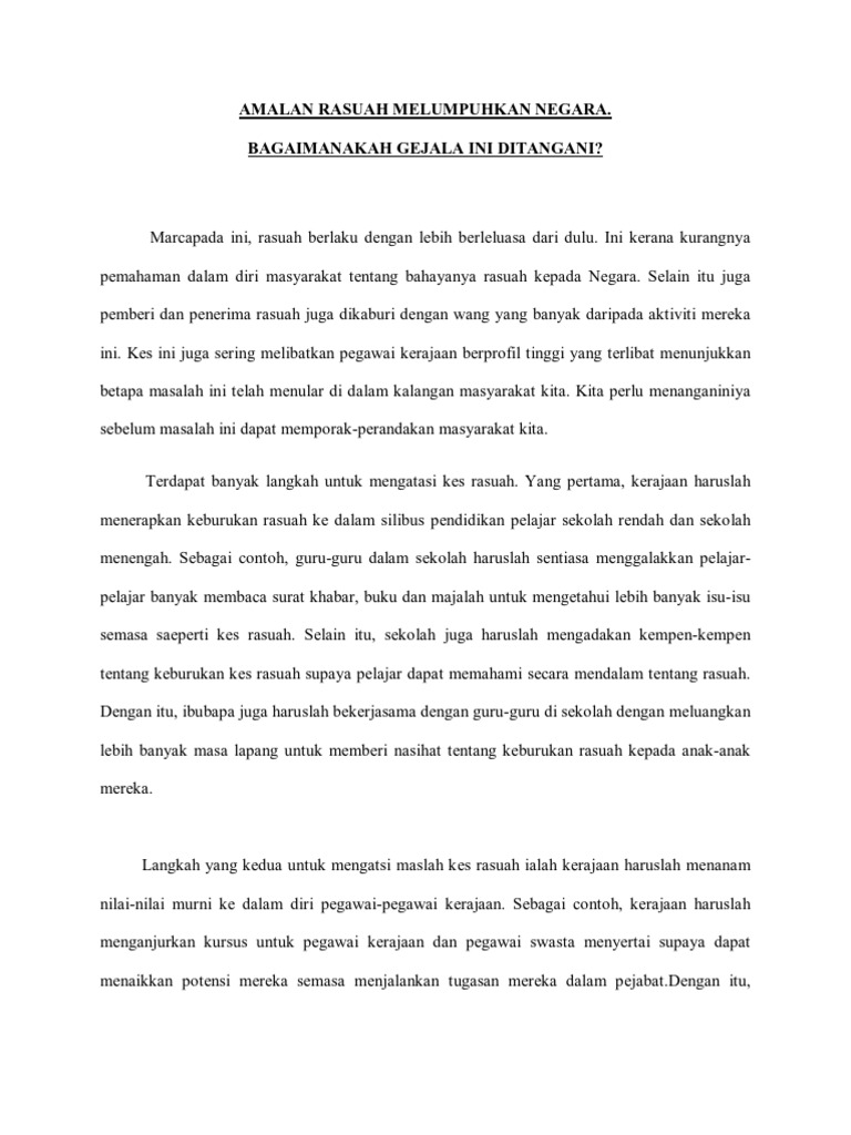 Semoga perkongsian bahan-bahan rujukan panduan bahan pembelajaran dan pengajaran contoh-contoh karangan sumber rujukan STPM Sijil Tinggi Persekolahan Malaysia tingkatan 6 dalam post di blog Bumi Gemilang berguna dan dapat membantu para pelajar dan. HINA kotor dan jijik itulah kata-kata yang sesuai kita kaitkan dengan RASUAH. Kajian yang telah dijalankan menyatakan bahawa terdapat beberapa sebab atau punca yang telah mendorong kepada perlakuan rasuah.